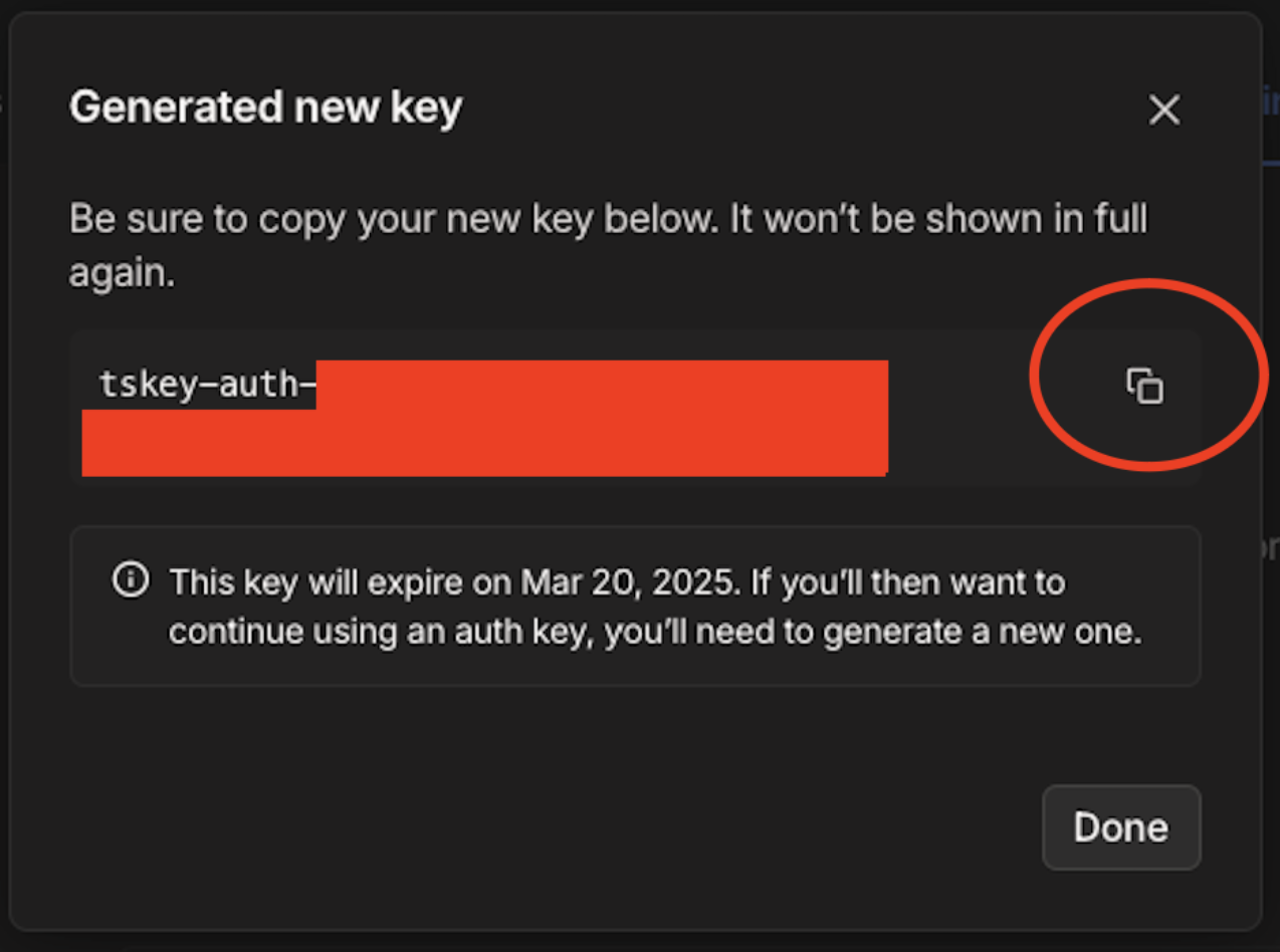 - Log in to Tailscale and navigate to Tailscale Admin Settings. Click on Generate auth key.