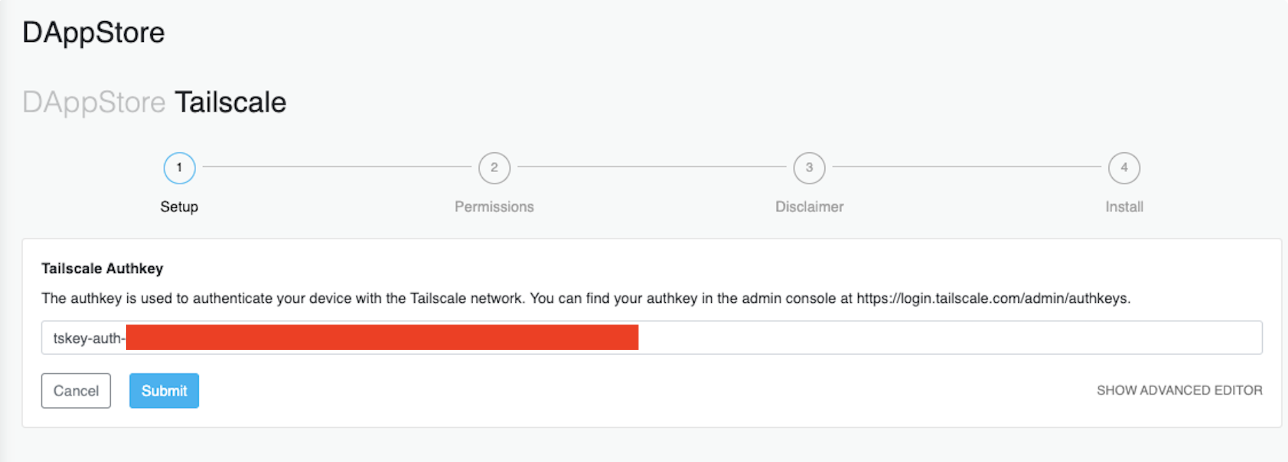 - Go to the Tailscale package in Packages tab and enter the auth key you created during installation.