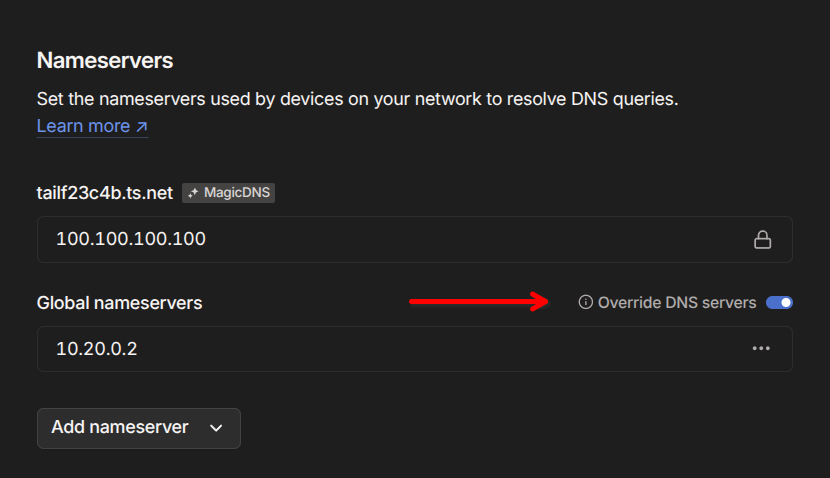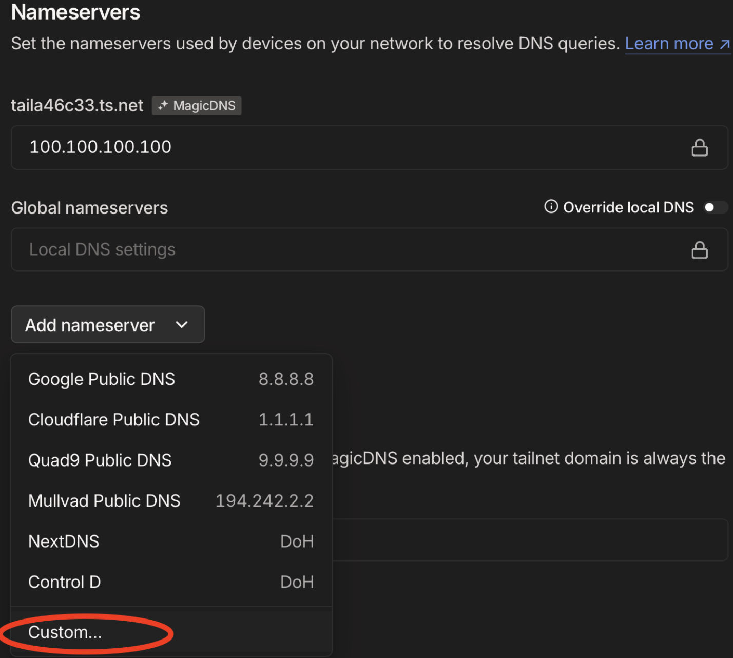 - Find the Nameservers section, click on "Add nameserver" and add a custom nameserver.
