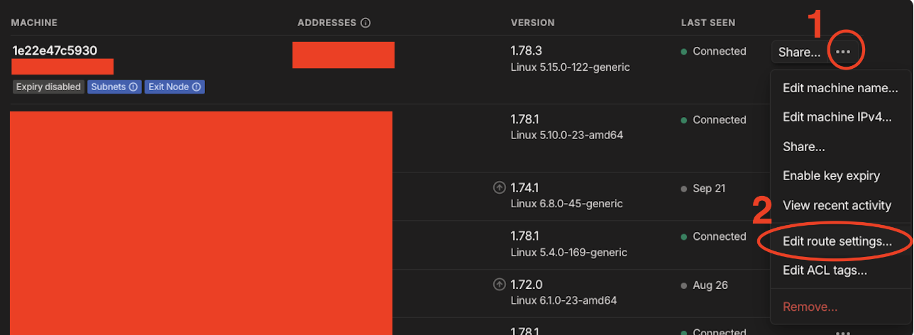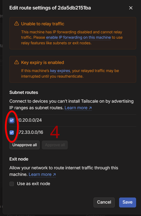 - Open the "Edit Route Settings" modal and check the Subnet Route that appears.