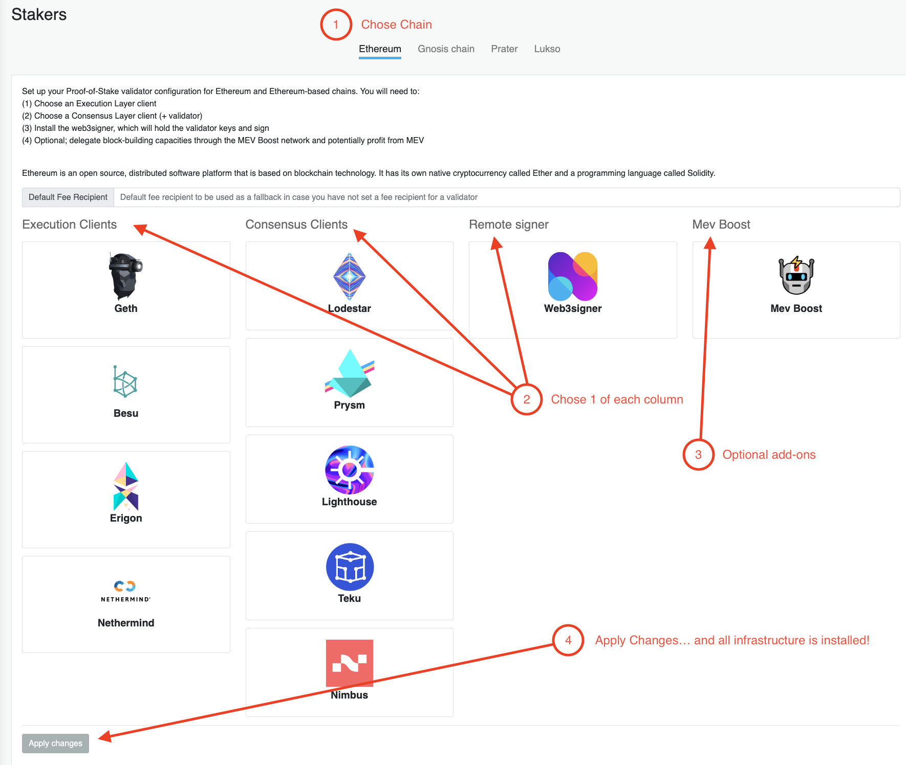 You can run all the infrastructure for Ethereum, Gnosis Chain and LUKSO in 4 steps through the Stakers UI: